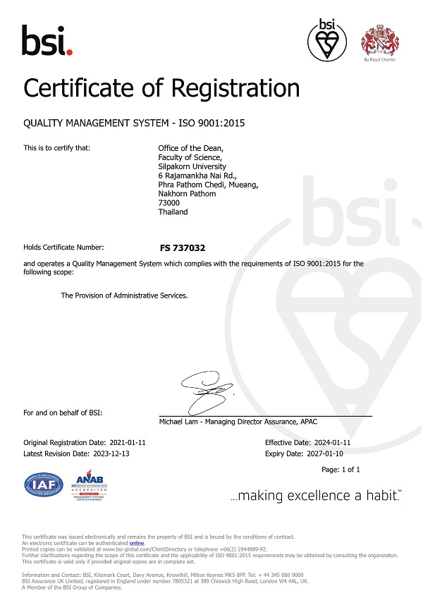 คณะวิทยาศาสตร์ มหาวิทยาลัยศิลปากร และได้ออกหนังสือรับรองการได้รับมาตรฐานการรับรอง